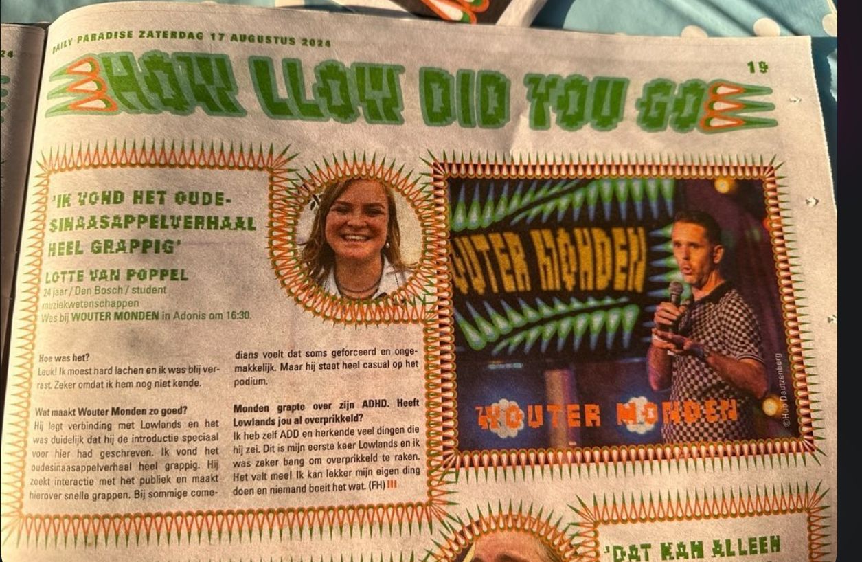 Na onze vakantie stond er gelijk al een van mijn hoogtepunten van dit seizoen in de planning. Ik mocht dit jaar optreden op Lowlands, echt te gek. Ik ben er vroeger vaak als bezoeker geweest en om er nu een half uur comedy te mogen doen voor een volle Adonis was echt waanzinnig. Op mijn Insta heb ik wat fragmenten gedeeld.